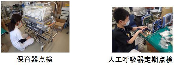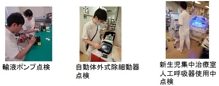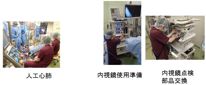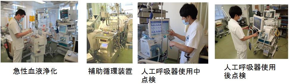 院内で使用されている医療機器のメンテナンス、人工呼吸器の管理、回路交換、患者管理モニターの使用状況把握などさまざまな業務を行っています。