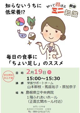 2月19日(木)に【知って得する健康ミニ知識】を開催します。テーマは「知らないうちに低栄養!?毎日の食事に「ちょい足し」のススメ」です。