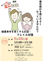 5月28日(木)に【知って得する健康ミニ知識】を開催します。テーマは「最近疲れを感じやすくなっていませんか?~健康寿命を長くするお話:フレイル対策~」です。